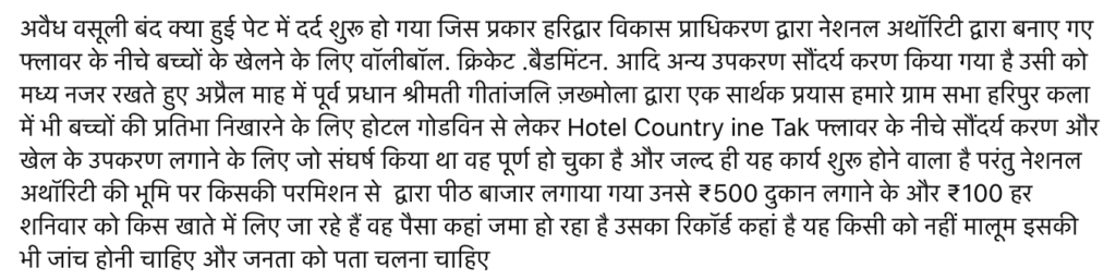 एक ग्राम वासी ने सोशल मीडिया पर पोस्ट करते हुए लिखा- अवैध वसूली बंद क्या हुई पेट में दर्द शुरू हो गया। जिस प्रकार हरिद्वार विकास प्राधिकरण द्वारा नेशनल अथॉरिटी द्वारा बनाए गए फ्लावर के नीचे बच्चों के खेलने के लिए वॉलीबॉल, क्रिकेट, बैडमिंटन आदि अन्य उपकरण सौंदर्यीकरण किया गया है। उसी को मध्य नजर रखते हुए अप्रैल माह में पूर्व प्रधान श्रीमती गीतांजलि ज़ख्मोला द्वारा एक सार्थक प्रयास हमारे ग्राम सभा हरिपुर कलां में भी बच्चों की प्रतिभा निखारने के लिए होटल गोडविन से लेकर Hotel Country Inn Tak फ्लावर के नीचे सौंदर्यीकरण और खेल के उपकरण लगाने के लिए जो संघर्ष किया था।