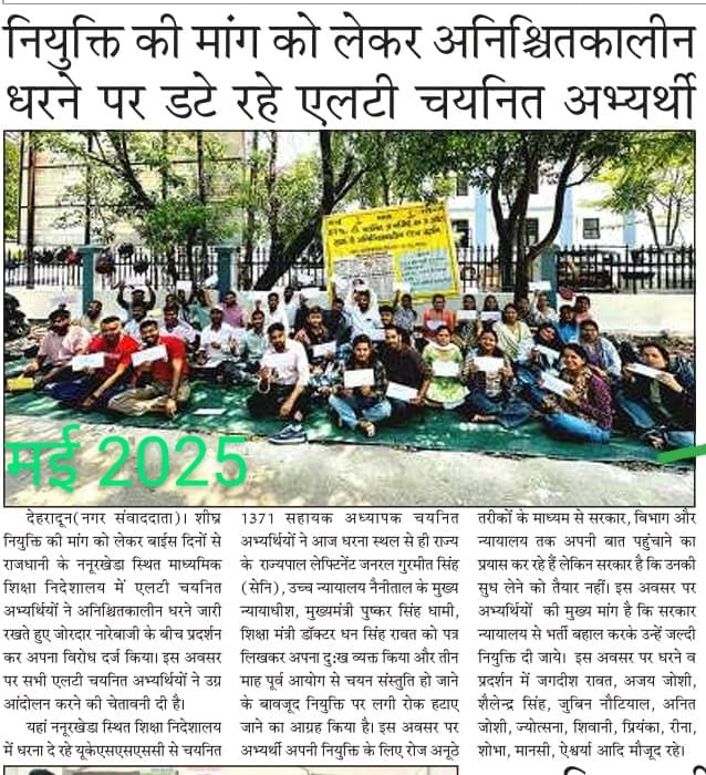 चयनित हुए अभ्यर्थियों का जीवन इस समय अंधकार में नजर आ रहा है। चयनित सहायक अध्यापक इससे पहले भी अपनी नियुक्ति के लिए निदेशालय के बाहर भारी संख्या में रैली निकाल चुके हैं। उन्होंने सरकार और शिक्षा विभाग पर नियुक्ति को लटकाने का आरोपी लगाया है। इससे पहले भी अतिथि शिक्षकों के द्वारा इस सीधी भर्ती में अधिमानी अंकों की मांग करते हुए इस भर्ती को 6 महीने तक कोर्ट में लटका कर रखा गया था। जिसमें नैनीताल हाईकोर्ट ने अतिथि शिक्षकों की याचिका को खारिज किया और रिजल्ट जारी करने का आदेश दे दिया था। लेकिन अब चयन संस्तुति होने के बाद फिर से सरकार आयोग द्वारा कछुए की चाल की तरह काम किया जा रहा है। जिस वजह से भर्ती प्रक्रिया को 6 महीने से लटकाया गया है। चयनित अभ्यर्थियों के साथ-साथ उनके परिवार वाले भी परेशान है। सभी अनिश्चितकालीन धरने पर बैठे हुए हैं और भूख हड़ताल करने को विवश है।