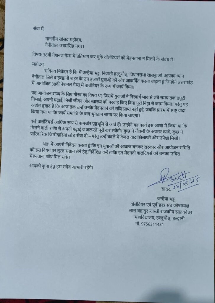 कन्हैया भट्ट, निवासी हल्दूचौड़ और वॉलंटियर के रूप में कार्यरत रहे पूर्व छात्र संघ कोषाध्यक्ष, ने इस मुद्दे को लेकर माननीय सांसद, नैनीताल-उधमसिंह नगर को ज्ञापन सौंपा है। ज्ञापन में कहा गया है कि “कई वॉलंटियर्स आर्थिक रूप से कमजोर हैं। उन्होंने पढ़ाई, पारिवारिक जिम्मेदारियों और यहां तक कि संभावित नौकरियों को त्यागकर राष्ट्र सेवा का कार्य चुना। लेकिन आयोजन समाप्ति के बाद न तो किसी अधिकारी ने संपर्क किया, न कोई भुगतान हुआ।”